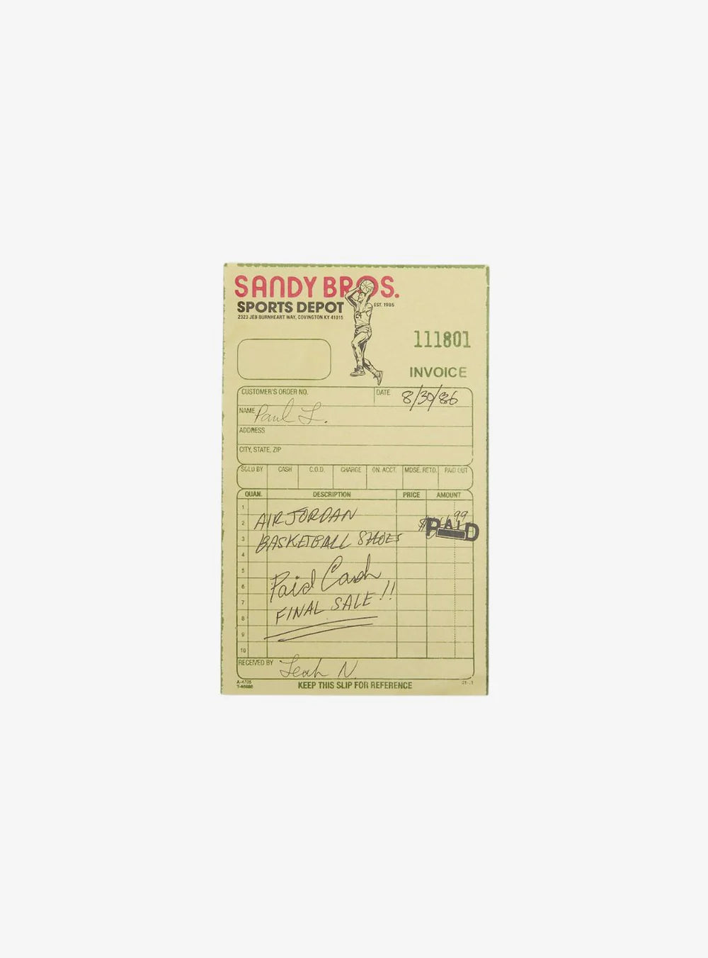 La tomaia riprende la classica colorazione “Chicago” — bianco, rosso varsity e nero — ma con dettagli volutamente invecchiati: il collarino in pelle cracklé nera, l’intersuola ingiallita e una finitura leggermente usurata sulla pelle rossa conferiscono un aspetto “vissuto”, come se la scarpa fosse stata appena riscoperta dopo decenni. Ogni paio viene anche corredato da una falsa ricevuta e da una scatola rétro, ulteriori dettagli che rafforzano la narrazione.