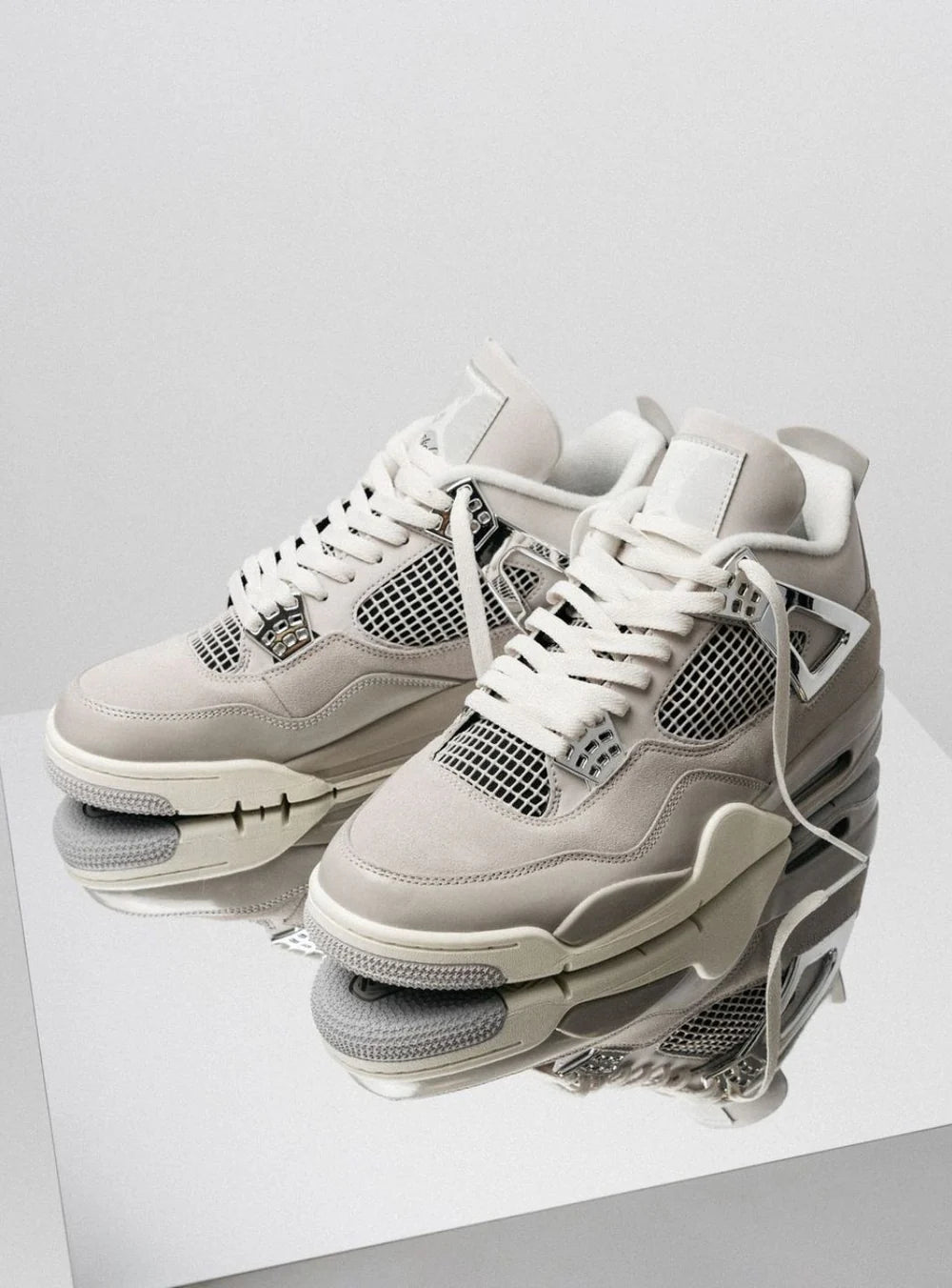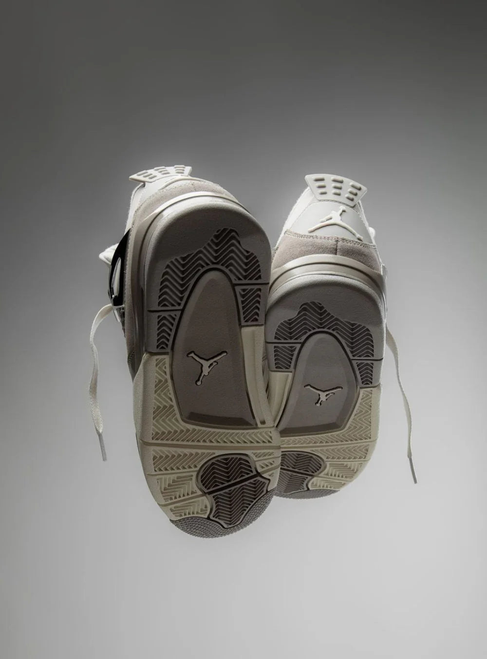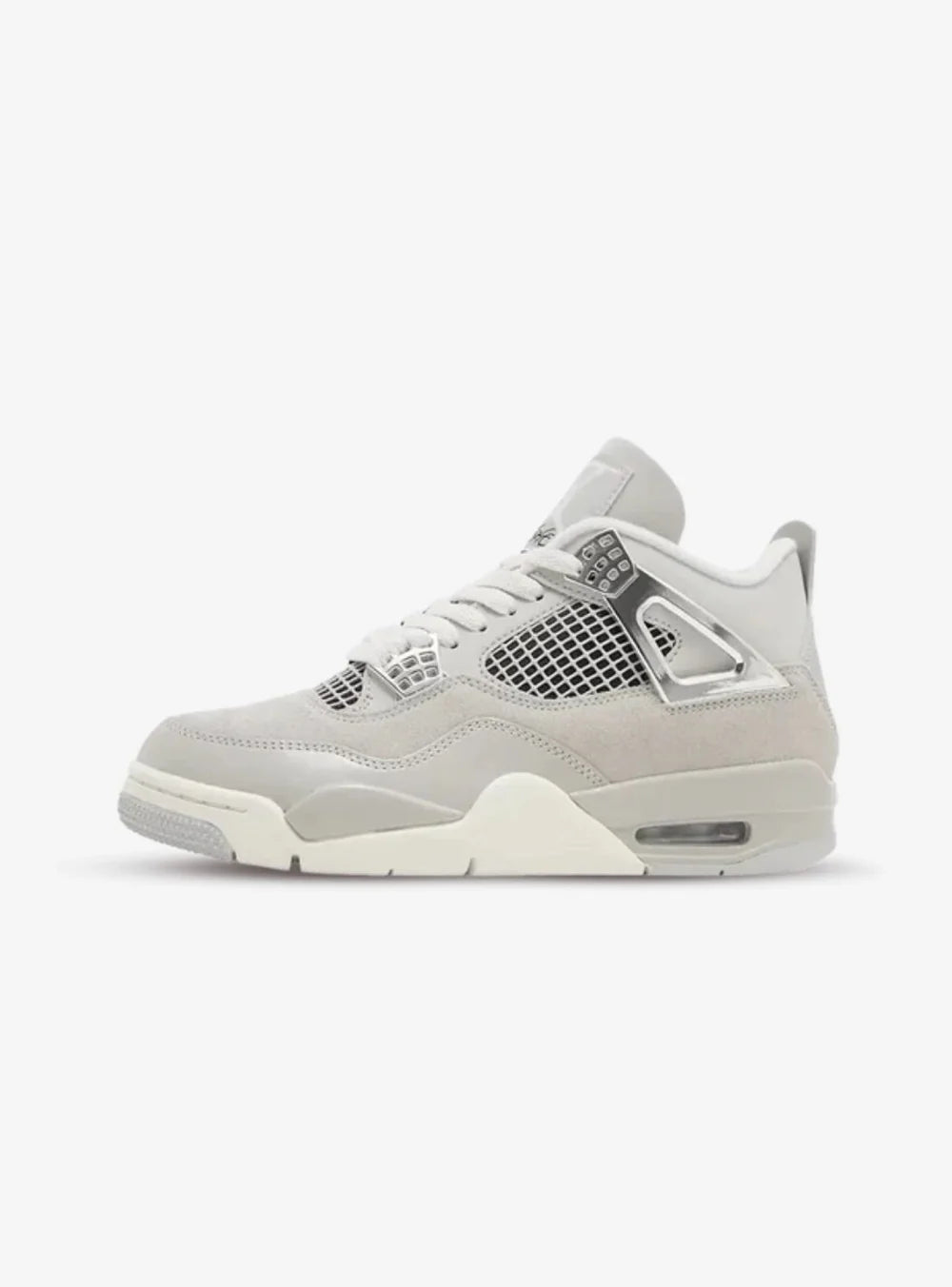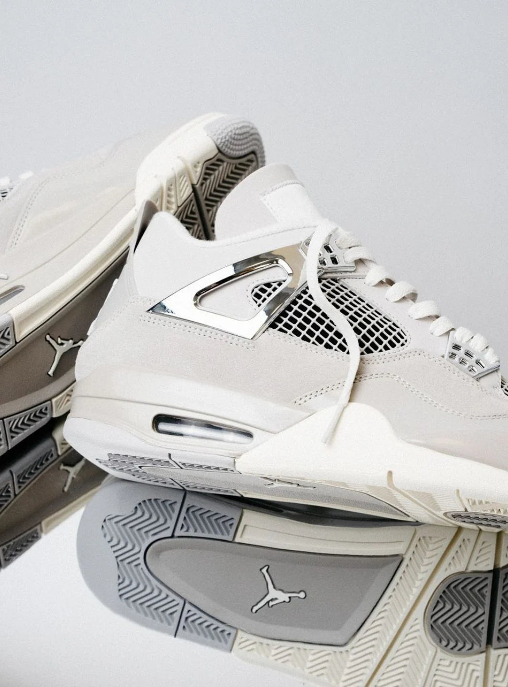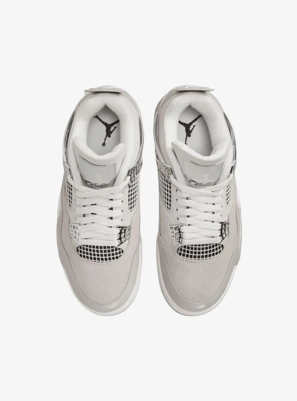 Le Air Jordan 4 Retro “Frozen Moments” si distinguono per una palette cromatica raffinata composta da Light Iron Ore, grigio neutro, nero e argento metallizzato, che dona un look elegante alla silhouette classica delle Jordan 4.