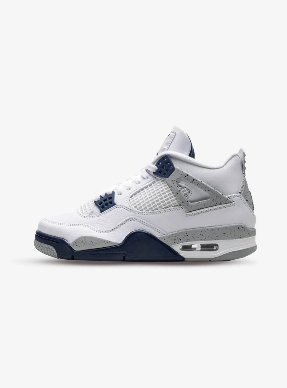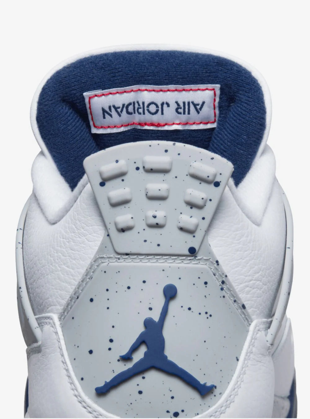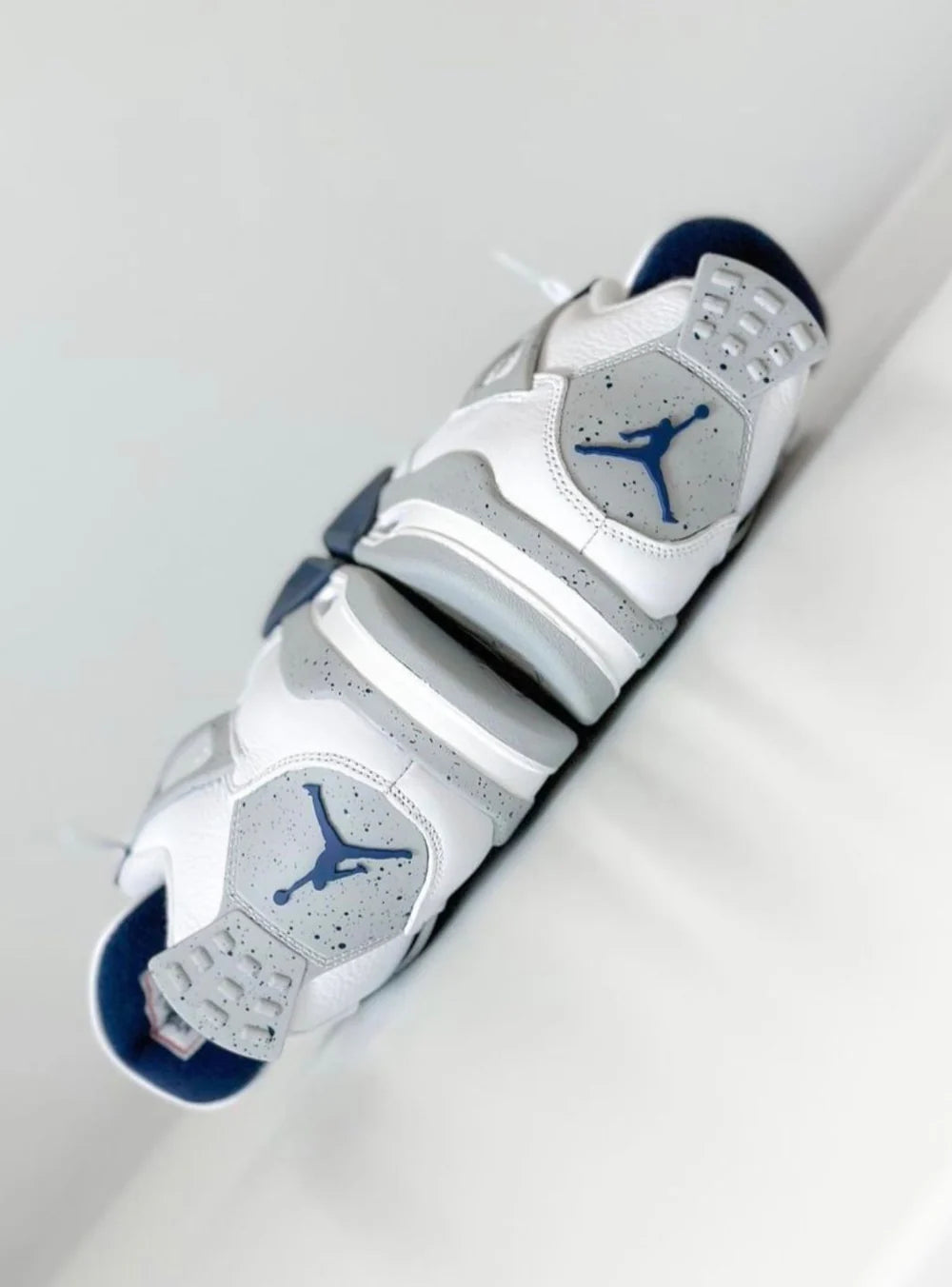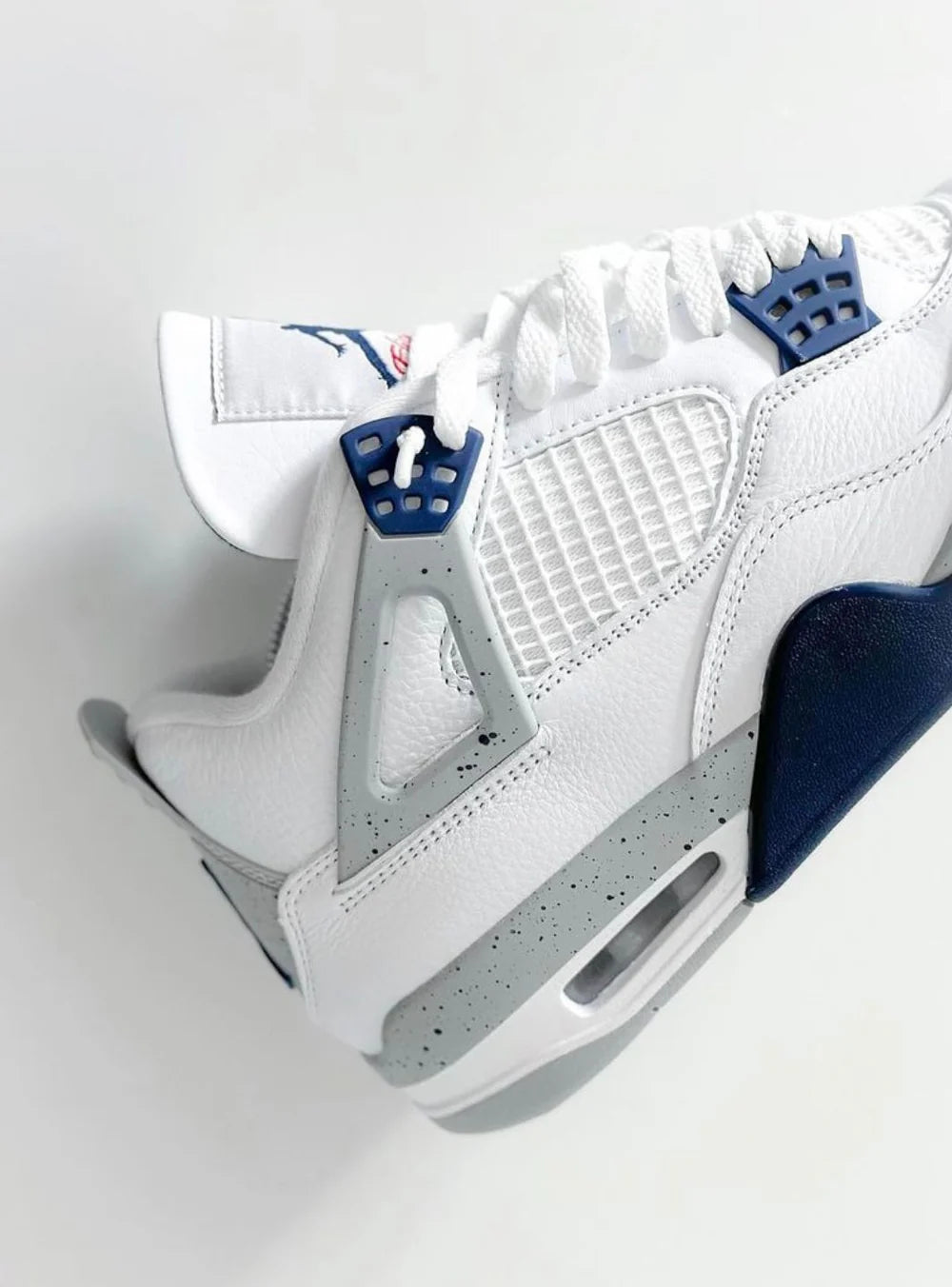 Le Air Jordan 4 White Midnight Navy si presentano con una tomaia in pelle bianca premium, impreziosita da dettagli come le classiche wings nere, simbolo di uno stile senza tempo. Un elemento distintivo del modello è il pannello in mesh bianco, collocato strategicamente sul lato della sneaker, appena dietro l’inconfondibile struttura in TPU tipica della serie.