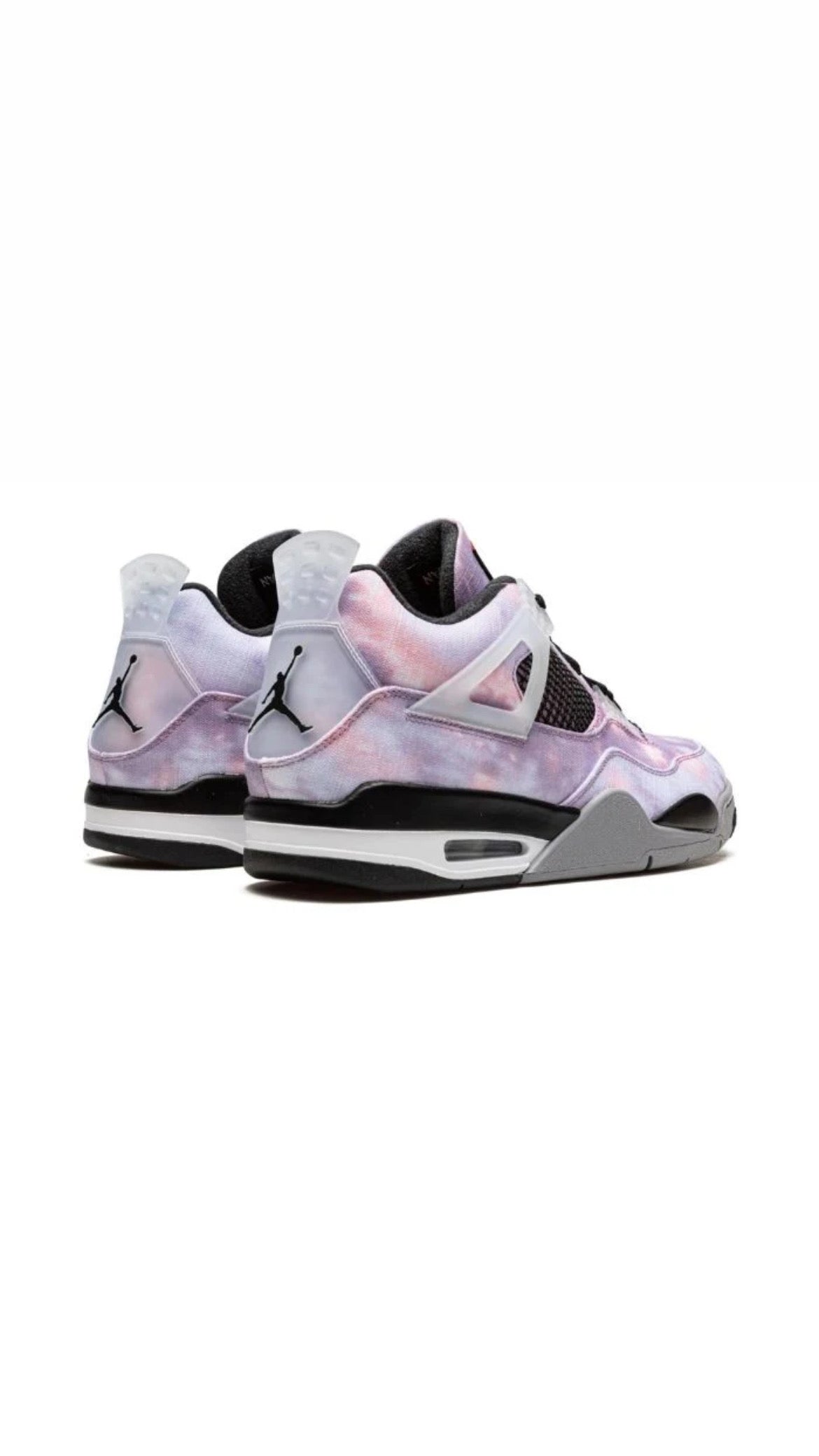 La tomaia è realizzata in un canvas tie-dye che fonde sfumature di viola, rosa e azzurro, evocando atmosfere eteree e psichedeliche. Il contrasto con i dettagli neri su occhielli, collarino e midsole dona equilibrio visivo e intensità, mentre il tallone trasparente con logo Jumpman aggiunge un tocco moderno e distintivo. Nonostante la palette inusuale, la scarpa mantiene l’anima grintosa della Jordan 4, rendendola perfetta sia per la collezione che per l’uso urbano.