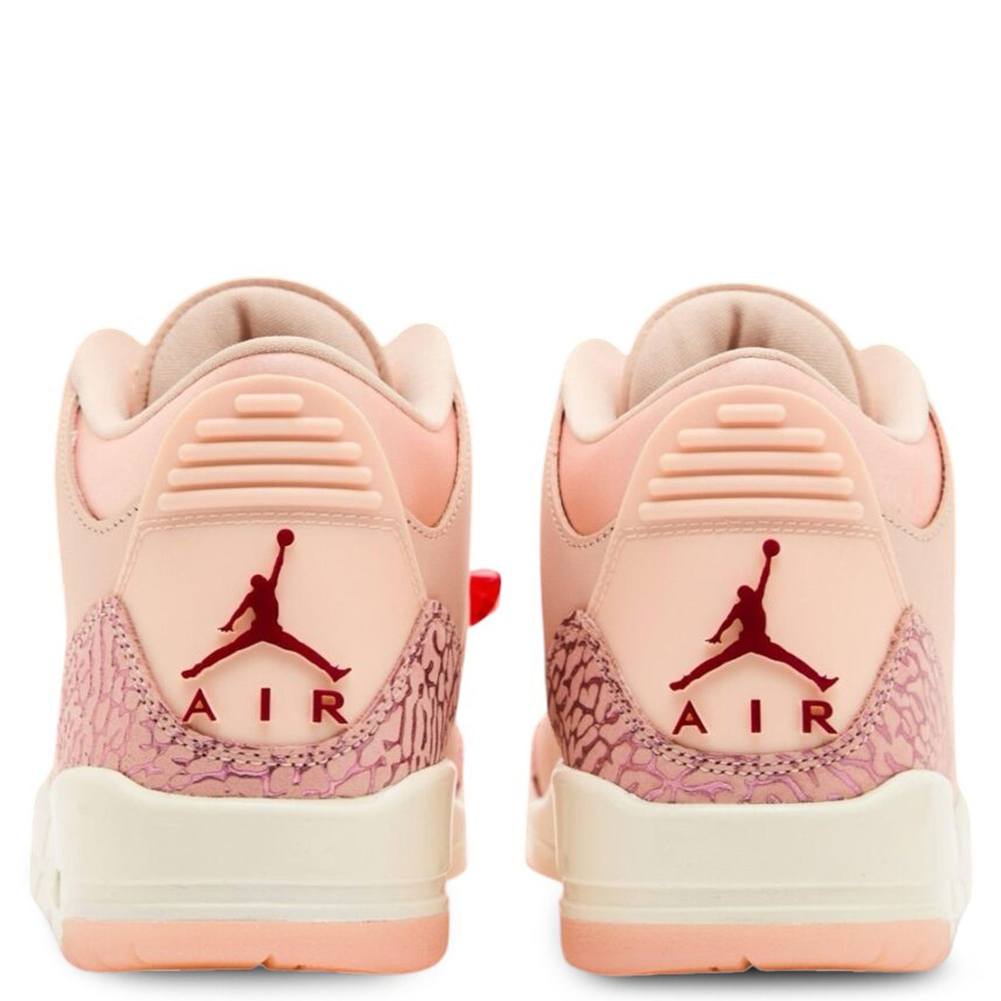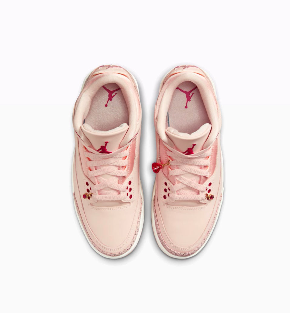 Le Air Jordan 3 Retro “Valentine’s Day Treat Yourself” sfoggiano una tomaia in Washed Coral, una nuance rosa tenue che dona alla scarpa un’aura elegante e femminile. Gli accenti in rosso vivace impreziosiscono il logo sulla linguetta e i passanti dei lacci, aggiungendo energia e calore al look complessivo. Sul tallone, il classico logo Jumpman fa da richiamo alla storica eredità del marchio Jordan. La midsole in tonalità Sail completa l’insieme con un tocco di classe, mentre la suola in gomma semi-trasparente introduce un elemento moderno che migliora sia l’estetica che la funzionalità, offrendo maggiore comfort e resistenza.