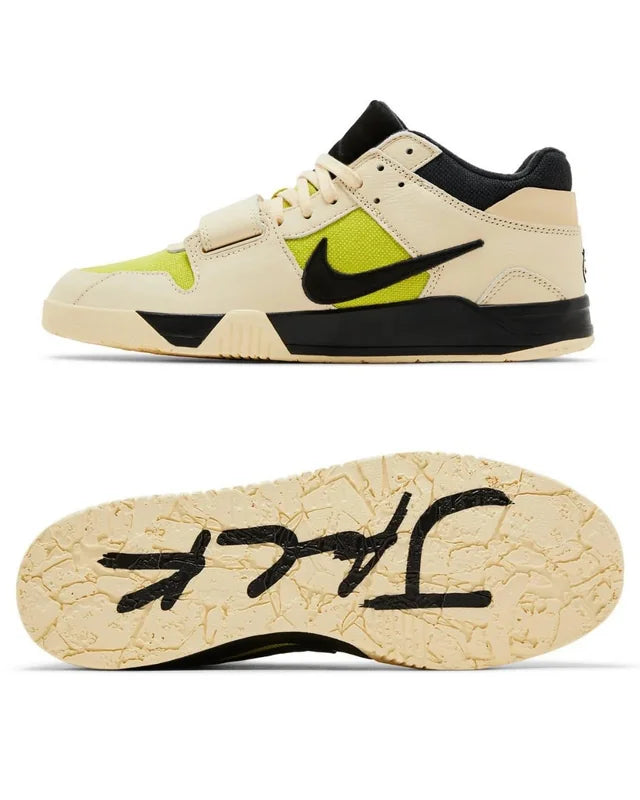Per i fan di Travis Scott, il logo Cactus Jack impresso sul tallone è un must, un simbolo che ha ormai un posto d’onore nel mondo delle collaborazioni tra moda e musica, aggiungendo ulteriore valore alla sneaker e trasformandola in un pezzo esclusivo da collezione. La suola in gomma color crema assicura una trazione ottimale e una lunga durata, mentre sul fondo della scarpa spicca la scritta “Jack” in lettere nere, un dettaglio audace che dona ancora più personalità al design complessivo, mettendo in evidenza l’identità unica della collaborazione.