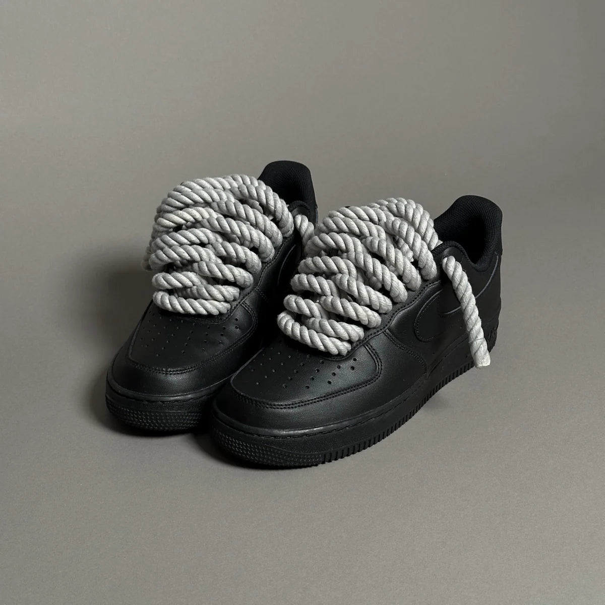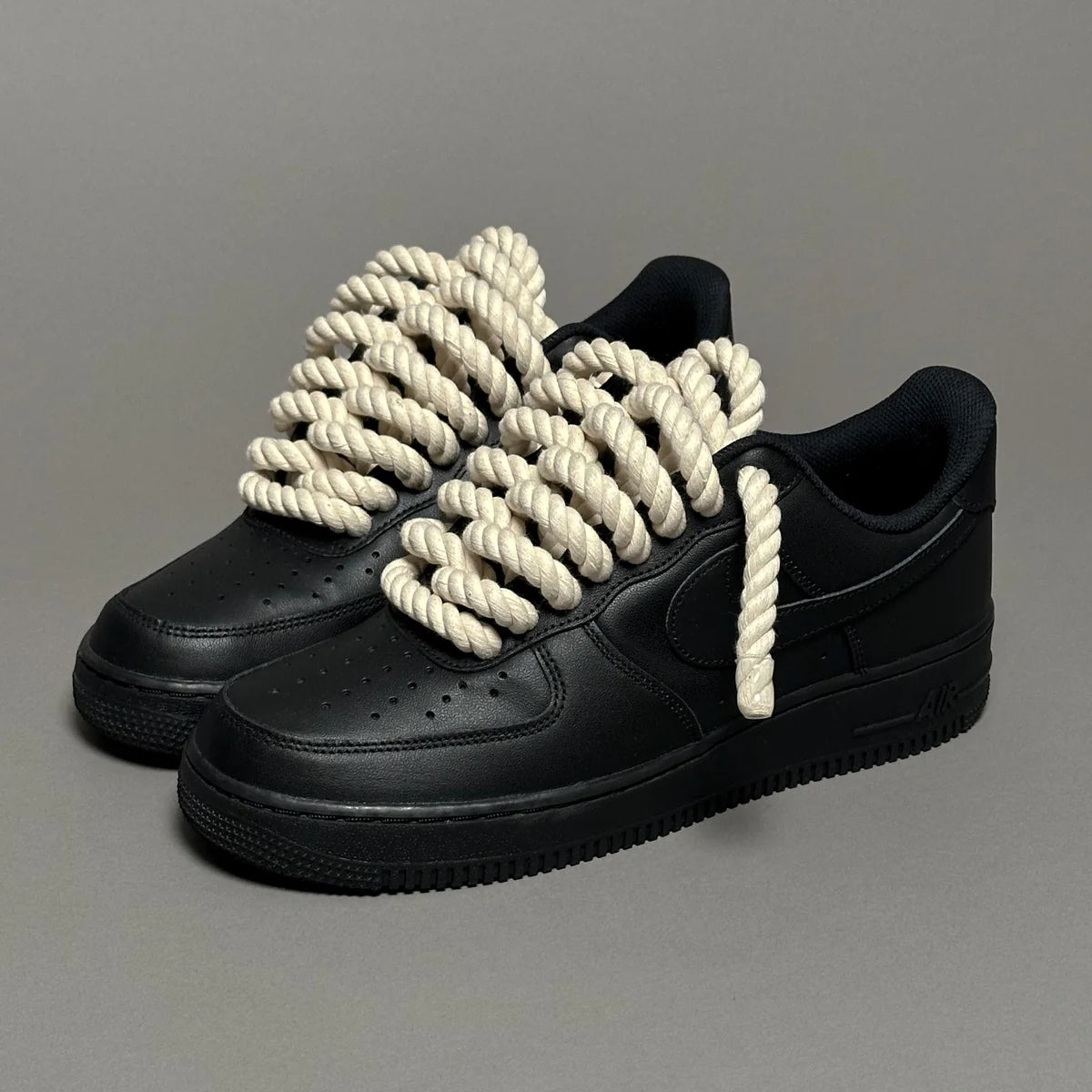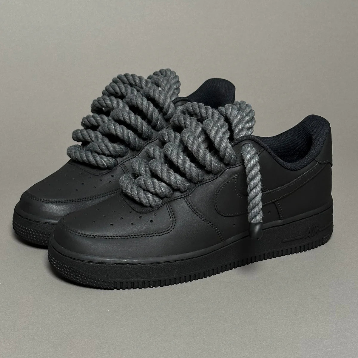 Le Nike Air Force 1 ‘07 Black Ropes Laces fondono l’iconica estetica delle Air force 1 total black con un tocco sperimentale dato dai lacci in corda oversize. Il contrasto tra la silhouette low-top pulita e le corde massicce dona alla sneaker un look unico, urban e provocatorio, ideale per chi vuole distinguersi nel panorama streetwear contemporaneo.