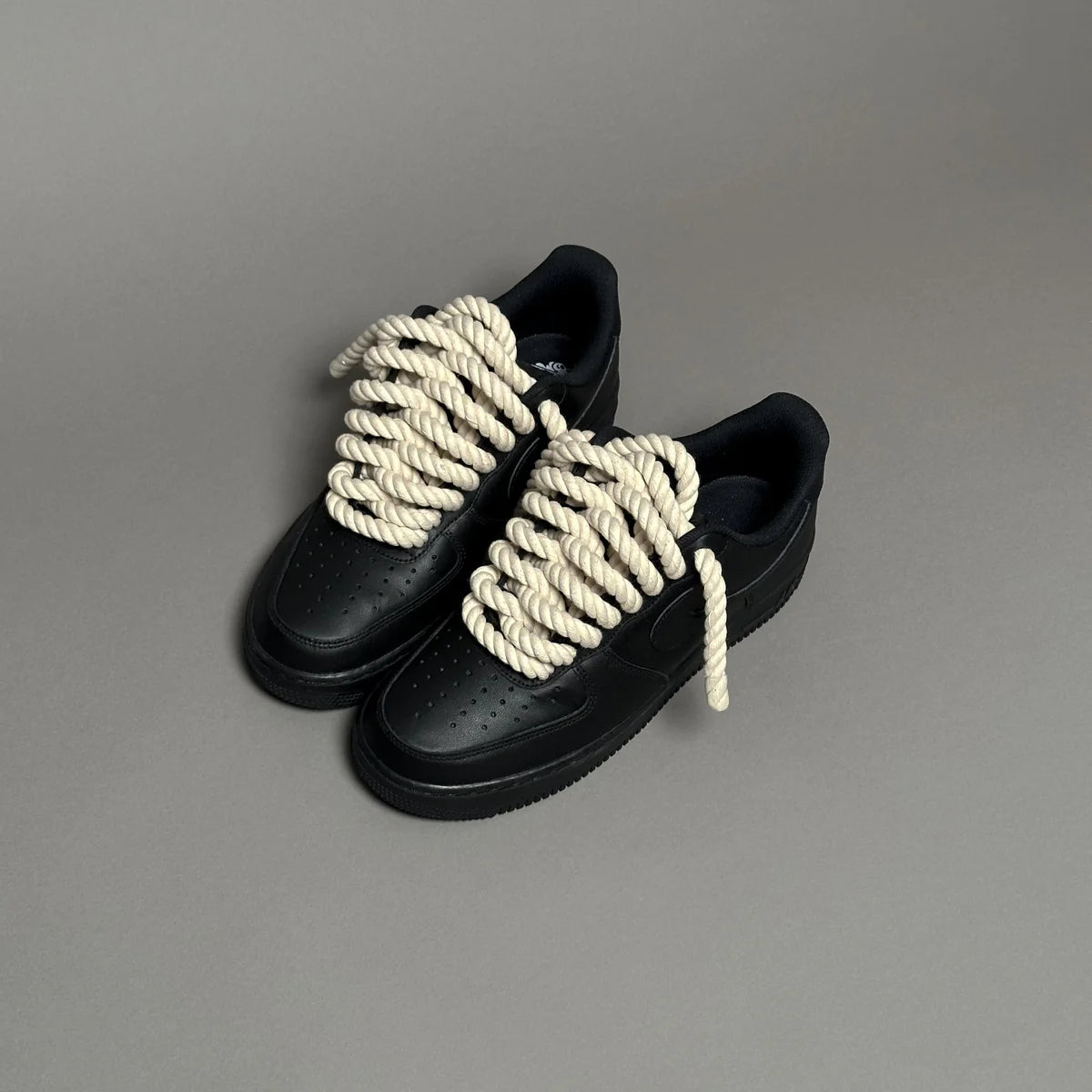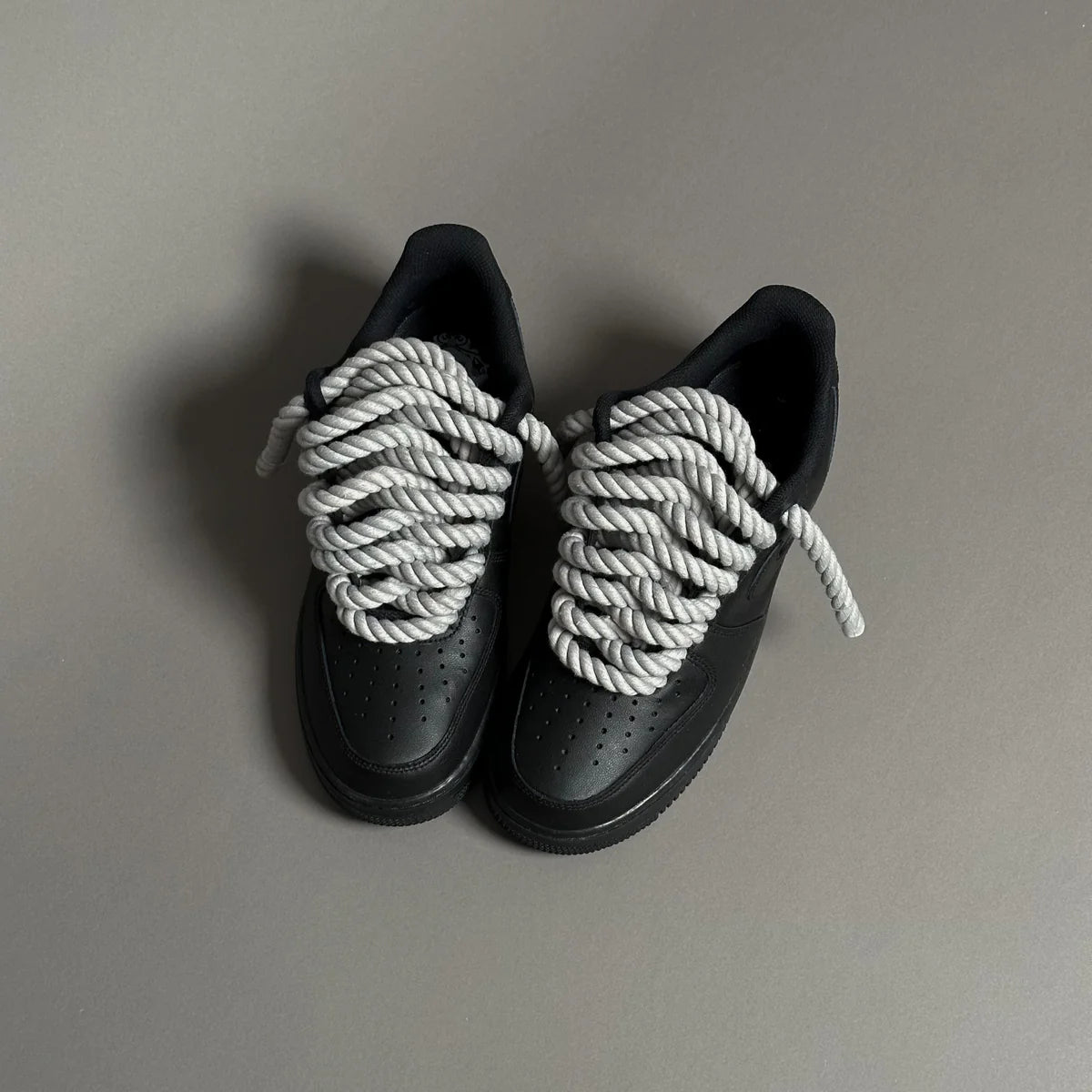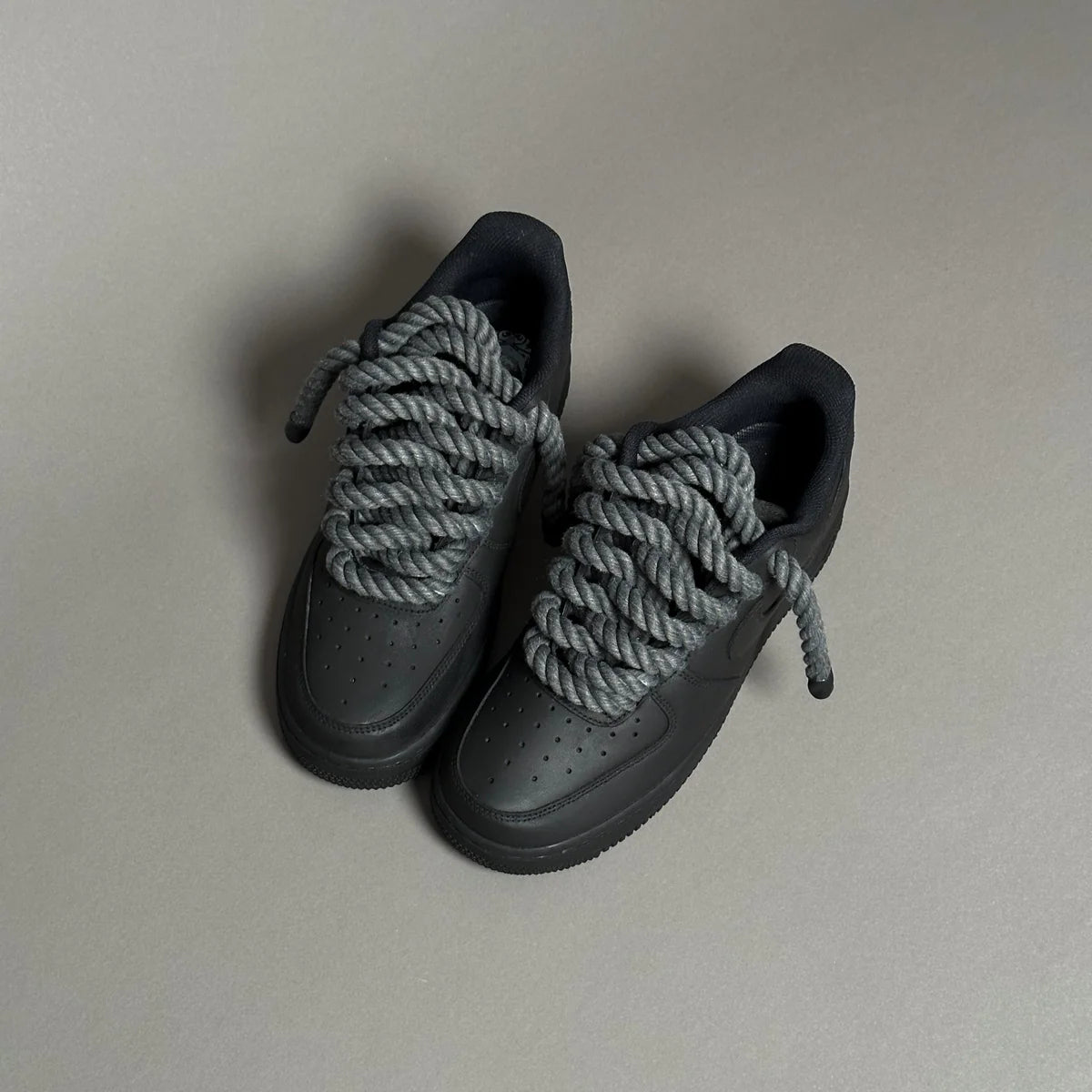 Le Nike Air Force 1 ‘07 Black Ropes Laces fondono l’iconica estetica delle Air force 1 total black con un tocco sperimentale dato dai lacci in corda oversize. Il contrasto tra la silhouette low-top pulita e le corde massicce dona alla sneaker un look unico, urban e provocatorio, ideale per chi vuole distinguersi nel panorama streetwear contemporaneo.