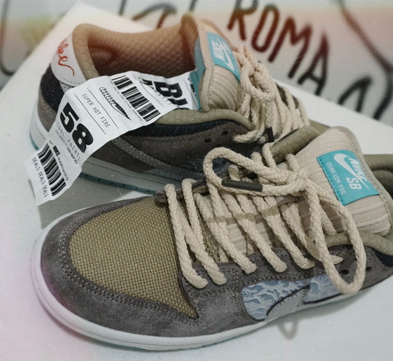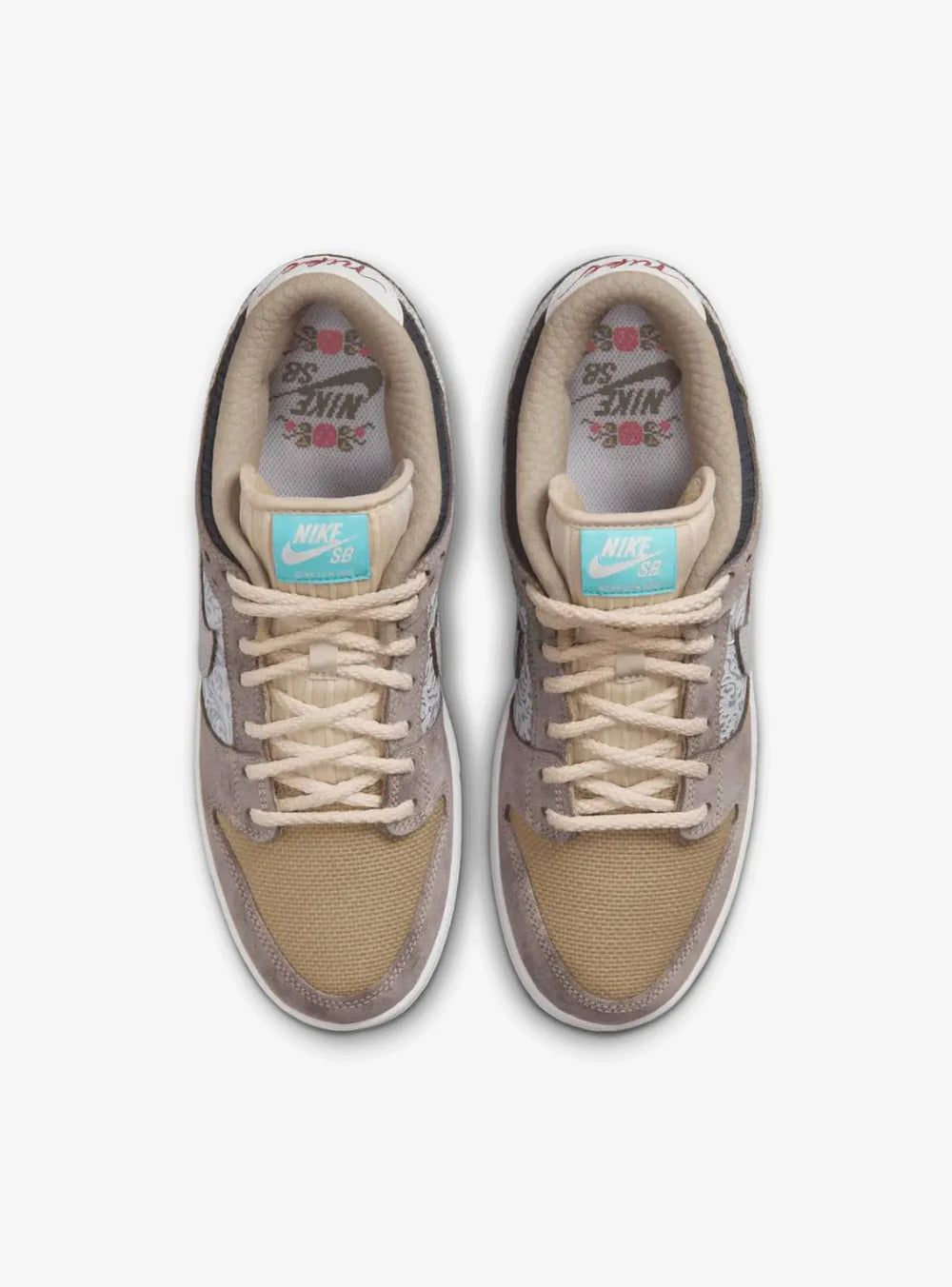 Le Nike SB Dunk Low Big Money Savings si distinguono per un mix cromatico che include tonalità di marrone, bianco, sabbia, grigio fumo e acquamarina, richiamando l’estetica eclettica degli oggetti che si trovano nei mercatini dell’usato o nei negozi di antiquariato.