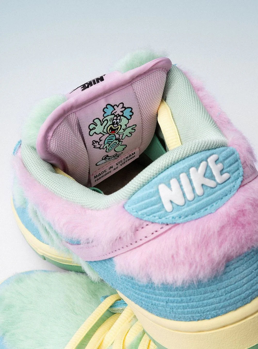 La tomaia è realizzata in un mix di materiali pelosi e vivaci, con colori che ricordano l’estetica kawaii e cartoon del personaggio Visty, mascotte originale creata da Verdy. I dettagli multicolore – tra cui azzurro, rosa, verde lime e giallo – rendono ogni paio unico e altamente riconoscibile. L’etichetta sulla linguetta e la soletta interna presentano grafiche esclusive dedicate al personaggio Visty, mentre la suola traslucida completa il look con un tocco moderno.