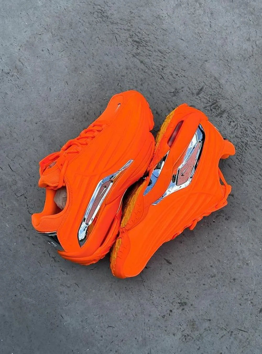 La sneaker si presenta in un audace e accattivante Total Orange, che domina tomaia e suola con un effetto monocromatico di forte impatto. Le linee futuristiche, l’intersuola scolpita e i dettagli aerodinamici richiamano l’estetica tech-runner anni 2000, mentre il branding NOCTA aggiunge esclusività e riconoscibilità. Una scarpa pensata per chi vuole distinguersi con carattere, tra hype e performance.