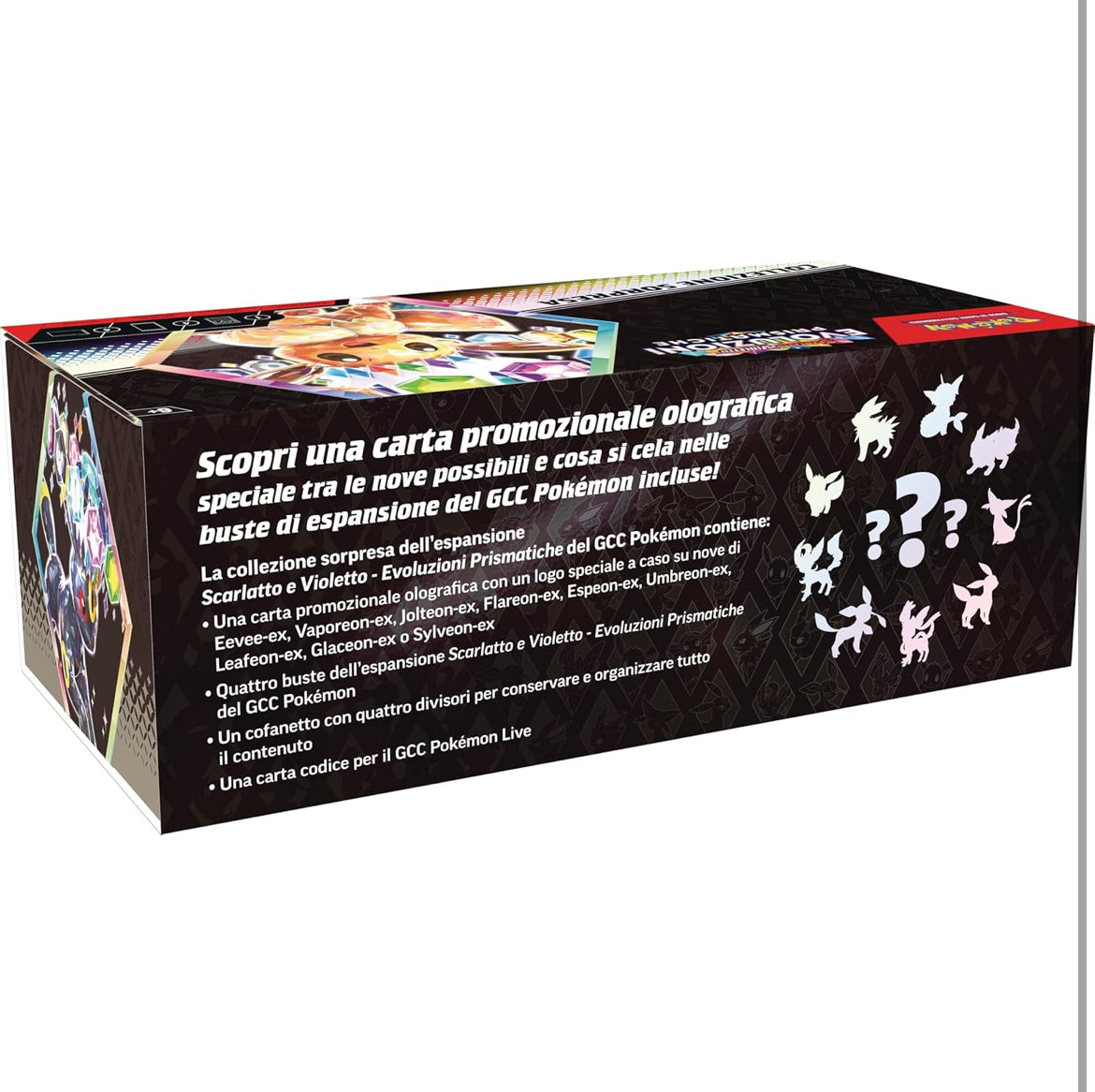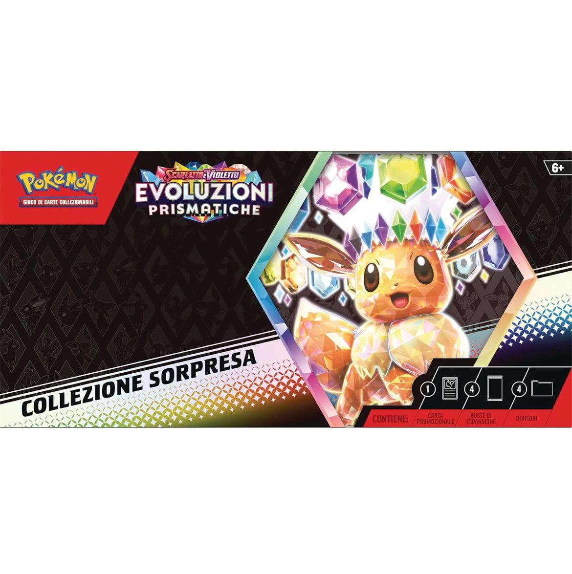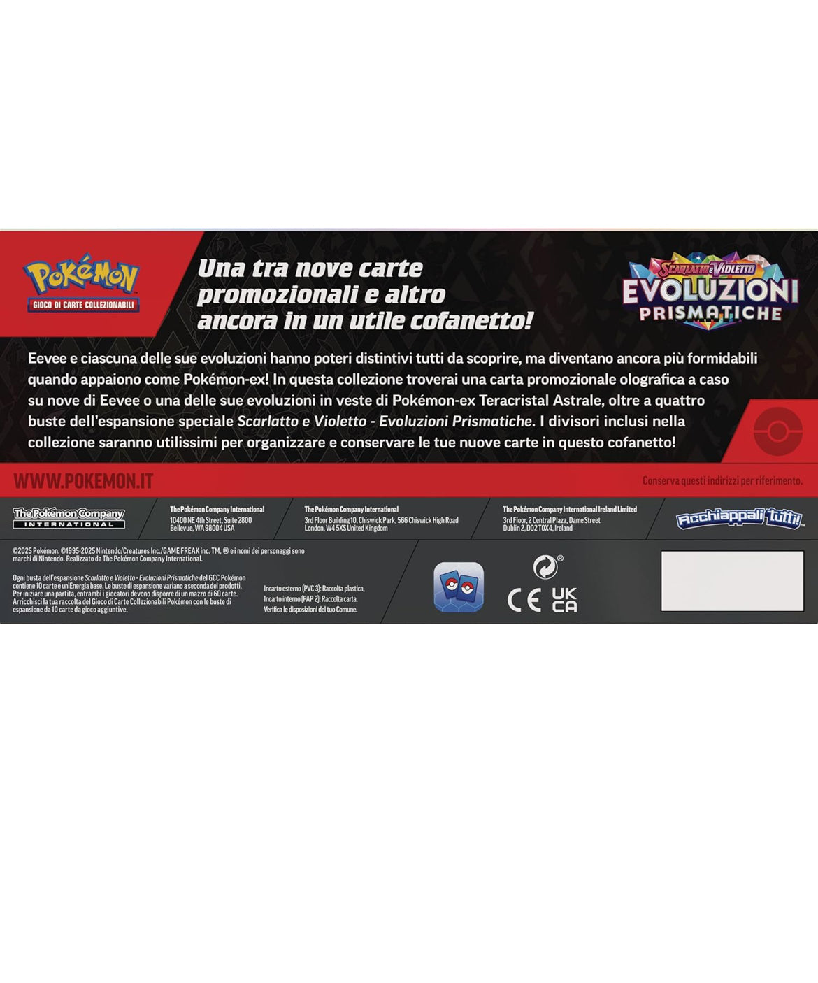 Questa collezione speciale include una carta promozionale olografica a sorpresa tra nove possibili, raffigurante Eevee o una delle sue evoluzioni nella loro versione Pokémon-ex Teracristal Astrale, insieme a quattro buste dell’espansione speciale Scarlatto e Violetto – Evoluzioni Prismatiche.