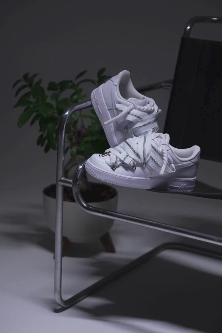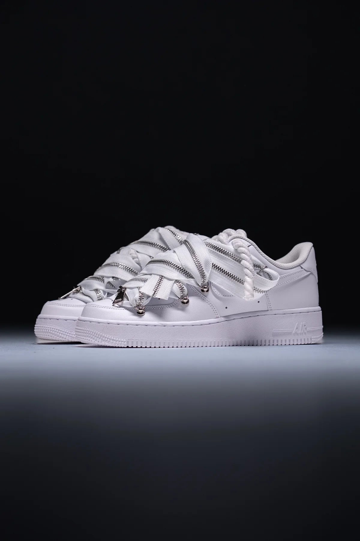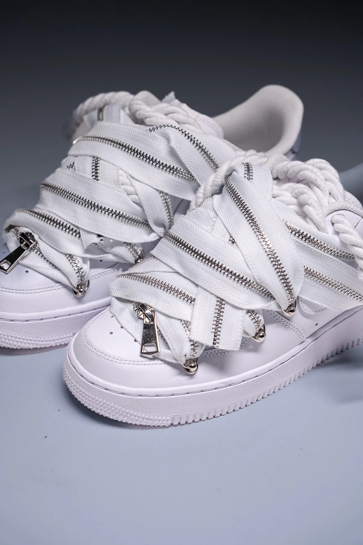 Rivoluziona il tuo stile con le Nike Air Force 1 White “Ropes Laces White” Zip: un’interpretazione audace della classica silhouette AF1. Caratterizzate da lacci rope bianchi oversize e zip funzionali intrecciate, queste sneakers fondono streetwear e sperimentazione fashion. La tomaia in pelle total white mantiene l’eleganza pulita dell’originale, mentre le personalizzazioni offrono un look unico e d’impatto.