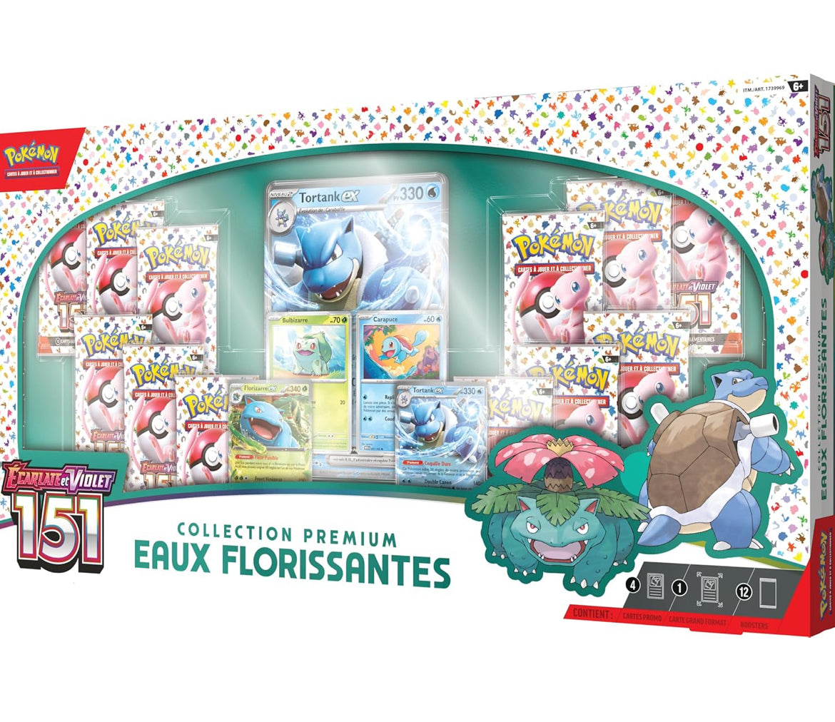 Scopri la magia dell’acqua e della natura con la Collection Premium Eaux Florissantes della celebre espansione Écarlate & Violet – 151. Questo set da collezione è un must per ogni allenatore che vuole rafforzare il proprio mazzo con Pokémon iconici come Tortank, Carapuce e Bulbizarre!